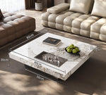 Key features: Low plinth base that makes the table feel like it’s floating in the room Integrated central tray area, perfect for drinks, candles, or a decorative centerpiece Durable, easy-to-clean surface designed for everyday use